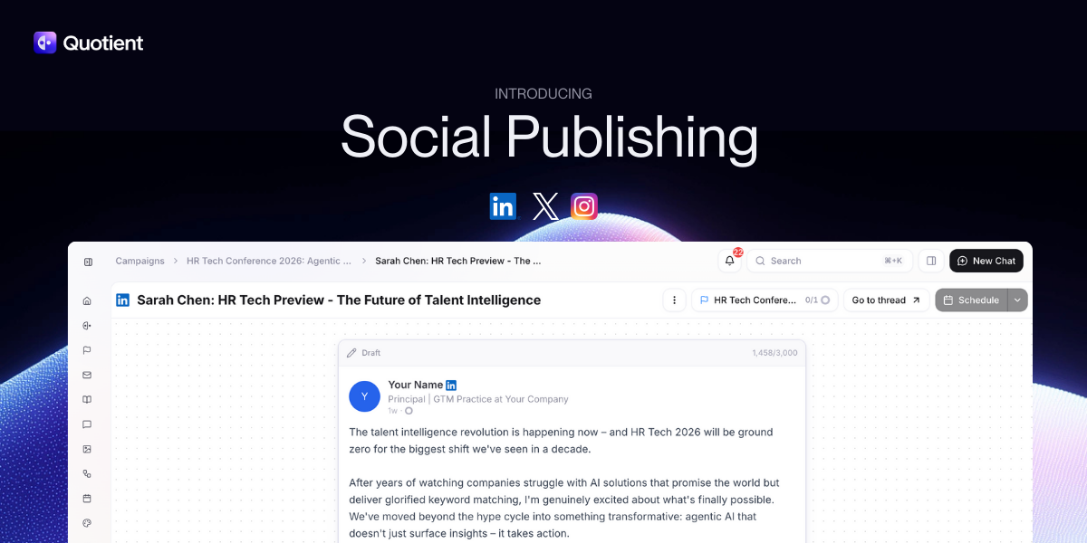 Social publishing is available now for all Quotient users. Start by mentioning @social-agent in any thread and ask it to create your first post.