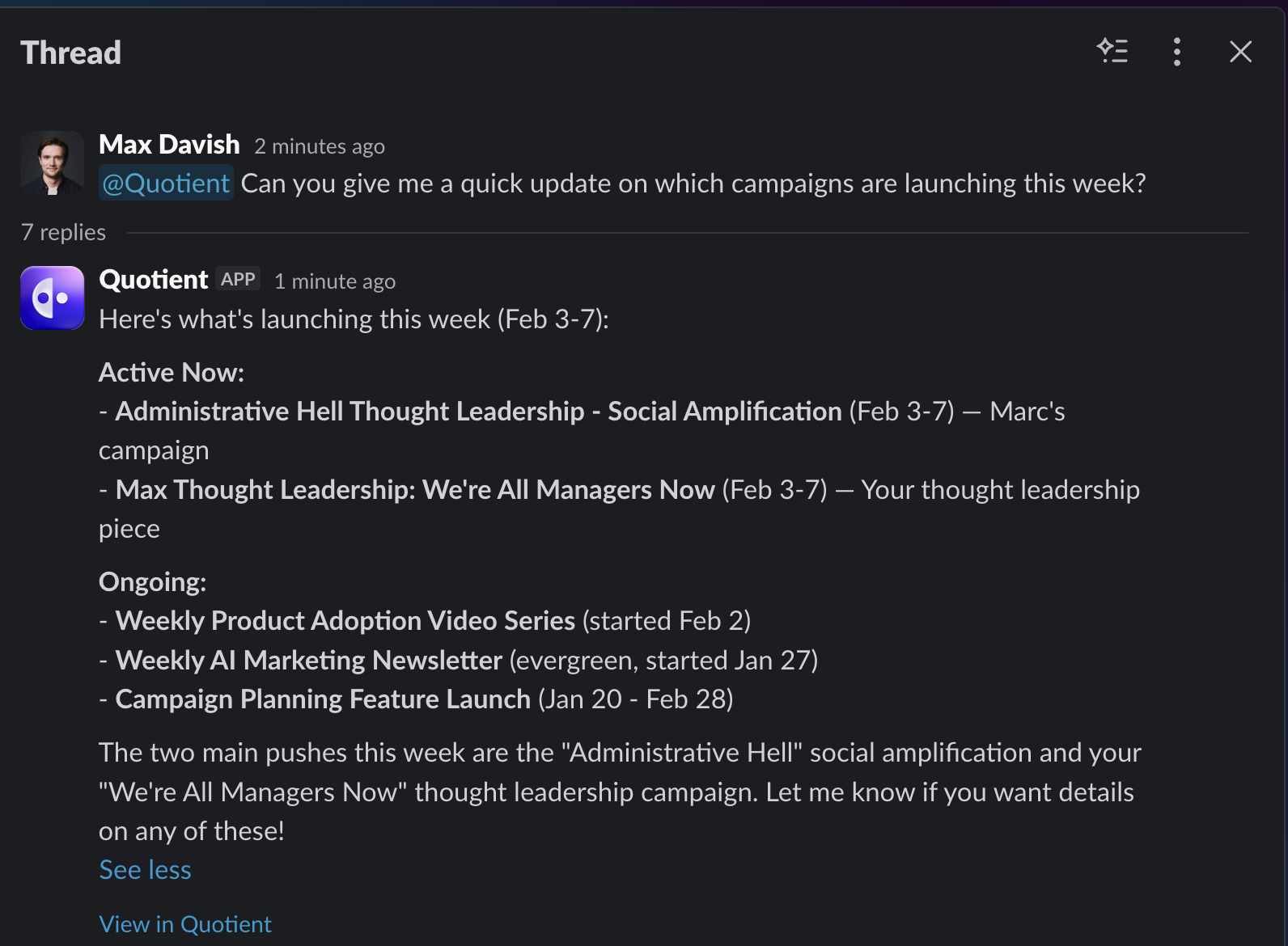 The entire conversation—including all the work the agents did—is visible in Quotient. Just click the "View in Quotient" link in the response to see the full thread.